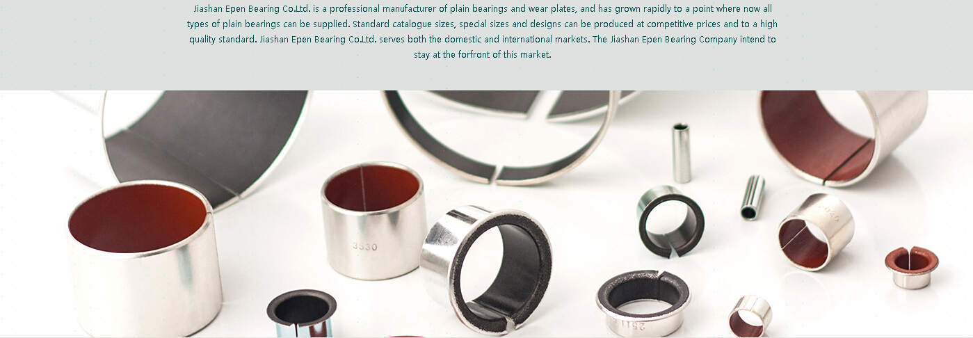 Jiashan Epen Bearing Co.Ltd. is a professional manufacturer of plain bearings and wear plates, and has grown rapidly to a point where now all types of plain bearings can be supplied. Standard catalogue sizes, special sizes and designs can be produced at competitive prices and to a high quality standard. Jiashan Epen Bearing Co.Ltd. Serves both the domestic and international markets. The Jiashan Epen Bearing Company intend to stay at the forfront of this market. The self-lubricating bearings supplied by Jiashan Epen Bearing Co.Ltd. are maintenance free and are ideally suitable to oscillatory motion, linear motion, difficult working environments, high temperature applications, etc.