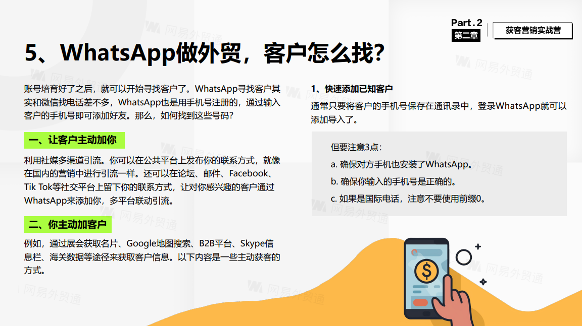 WhatsApp流量大、效率高,是当今外贸人低成本获客的绝佳平台之一。但很多刚上手的外贸人会遇到一些问题,例如账号不稳定、一味群发广告、找不到客户……用WhatsApp获客、引流到底该怎么做?账号启动运营初期有哪些注意事项?如何发消息才能收到客户的回复和询盘?