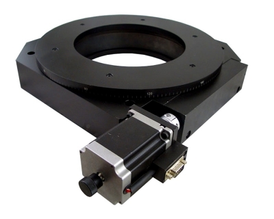 The low cost, low profile AY110-300 Rotary Stage features a very low backlash of 0.0005o, and a positional accuracy of 0.001o, making it ideal for: Laser positioning and machining, scribing, microscopy, testing, assembly, inspection, alignment, and other critical applications. This black anodized stage has a load capacity of 65Kg (143 lbs) and there is an indicator scale for visual sighting of the angle of rotation. The stage can be ordered with Plug-and-Play with a fully compatible controller from OES.