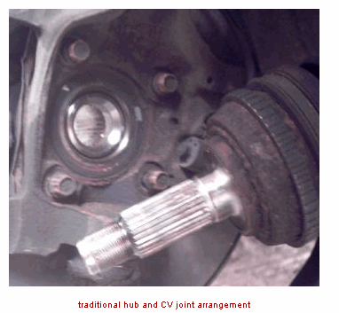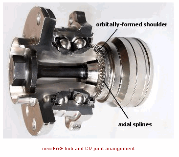 FAG points out that the traditional drive arrangement has its faults; there must be clearance to allow the CV joint to slide into the wheel bearing unit. Under day-to-day loads and use, but especially in high horsepower situations with high torque loading and tire friction, those splined areas can be stressed and loosen or fail. Even if they don't fail, over time the wear can cause driveline lash, felt inside the vehicle as harshness and/or vibration. In extreme cases, the splines or bearings can fail.