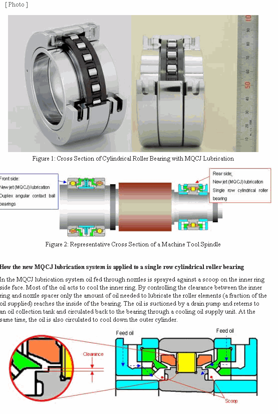 When the new MQCJ lubrication systemwas applied to a single row cylindrical roller bearing the ultra high dmn value of 3.35 million1) was achieved. By applying the new MQCJ jet lubrication system to the cylindrical roller bearing found at the rear side of many main spindles power losses from the bearing can be cut in half and the design can be simplified when compared with the conventional jet lubrication.