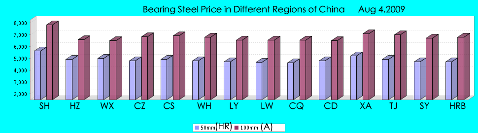 Aug 4 Bearing Steel Price in Different Regions of China (yuan/ton) 1) HR: hot rolled steel,diameter 50 mm 2) A: anneal rolled steel,diameter 100 mm Region code SH: Shanghai HZ: Hangzhou, Zhejiang province WX: Wuxi, Jiangsu province CZ: Changzhou, Jiangsu province CS: Changsha, Hunan province WH: Wuhan, Hubei province LY: Luoyang, Henan province LW: Laiwu, Shandong province CQ: Chongqing CD: Chengdu, Sichuan province XA: Xi'an, Shaanxi province TJ: Tianjin SY: Shenyang, Liaoning province HRB: Harbin, Heilongjiang province