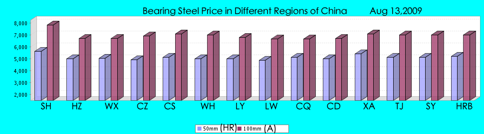 Aug 13 Bearing Steel Price in Different Regions of China (yuan/ton) 1) HR: hot rolled steel,diameter 50 mm 2) A: anneal rolled steel,diameter 100 mm Region code SH: Shanghai HZ: Hangzhou, Zhejiang province WX: Wuxi, Jiangsu province CZ: Changzhou, Jiangsu province CS: Changsha, Hunan province WH: Wuhan, Hubei province LY: Luoyang, Henan province LW: Laiwu, Shandong province CQ: Chongqing CD: Chengdu, Sichuan province XA: Xi'an, Shaanxi province TJ: Tianjin SY: Shenyang, Liaoning province HRB: Harbin, Heilongjiang province