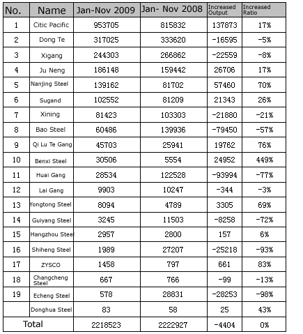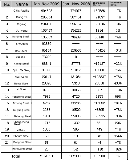 Table 2: Sequence of Steel Output of Bearing Steel Enterprises in China from Jan. to Nov. 2009