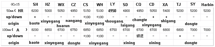 【East China Region】This week the bearing steel price in East China market keep steady; the deal was common. Up to this weekend, the quotation in Hangzhou market was as follows: Daye Nonferrous GCr15Φ50-70 non-annealed steel was 5,000yuan/ton; Xining Special Steel GCr15Φ30-75 heat treatment non-annealed steel was 4,950yuan/ton, out of stock; Shanghai No. 5 Steel Plant GCr15Φ26-70 heat treatment spheroidizing annealed steel was 6,700yuan/ton; Xingcheng Steel GCr15Φ50 non-annealed steel was 5,200 yuan/ton with rare stock; Nanjing Steel Group GCr15Φ16-40 heat treatment non-annealed steel was 4,950 yuan/ton; Dongbei Special Steel GCr15Φ30-95 heat treatment annealed steel was 5,650 yuan/ton; Shougang Group GCr15Φ50 hot rolled non annealed steel was 4,950 to 5000 yuan/ton. This week the bearing steel price in Wuxi market rose in a small range and the deal was common; Up to this weekend, the quotation in Wuxi market was as follows: Xingcheng Steel GCr15Φ30-75 hot rolled non annealed steel was 5,200 yuan/ton; Xingyegang Steel GCr15Φ30-50 continuous annealed steel was 5,500yuan/ton; Beiman Steel GCr15Φ40-75 heat treatment annealed steel was 5,650yuan/ton; Wuxi Huarun Steel GCr15Φ50-80 hot rolled non-annealed steel was from 5,050yuan/ton and the Φ50-80 annealed steel was 5,600yuan/ton, a few stock; Nanjing Steel GCr15Φ50 hot rolled non-annealed steel was 4,950yuan/ton; Bongbei Special Steel GCr15Φ40-75 hot rolled non-annealed steel was 5,100yuan/ton.