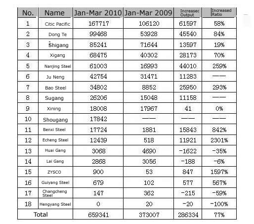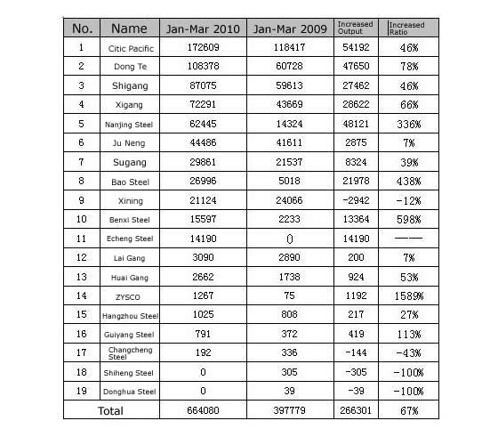 Table 2: Sequence of Steel Output of Bearing Steel Enterprises in China from Jan. to Mar. 2010