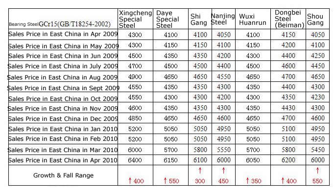 Table 3: Sales Price Summary of Bearing Steel Enterprises in East China Market in April, 2010 (medium continuous non-annealed steel bars)