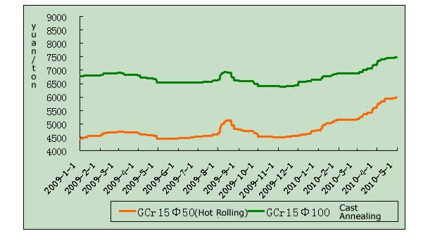 According to the data from Mysteel.com, up to the end of April, the countrywide average price of GCr15Φ continuous casting non-annealed steel of 50mm was 5,993 yuan/ton; the countrywide average price of GCr15Φ die-casting annealed steel of 100mm was 7,482 yuan/ton. The average rising range was between 300 to 400 yuan/ton, which was smaller than that in March.