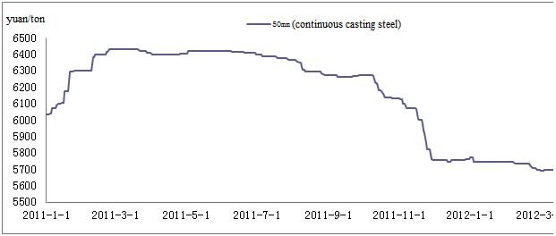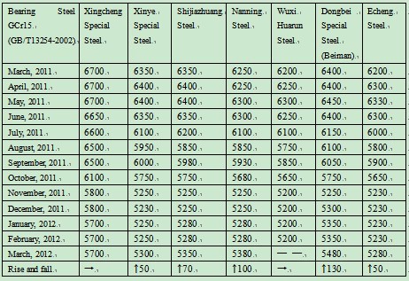 According to the statistics from Mysteeel.com: up to the end of December, 2011, the national average price of GCr15 Φ50mm continuous casting non-annealed steel was 5,700 yuan/ton; the national average price of GCr15 Φ100mm die-casting annealed steel was 8,093 yuan/ton. (some modifications applied to the statistical method)