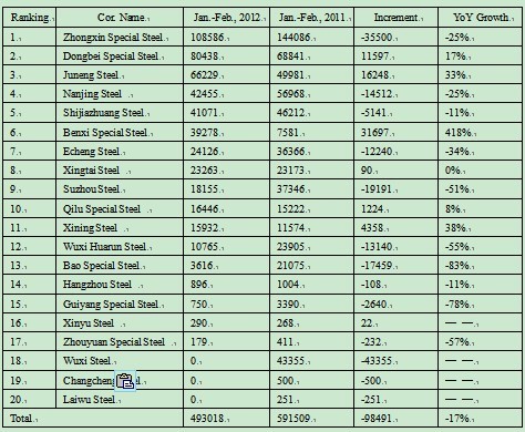 Seen from Table 1, we can know that the top three for bearing steel output from January to March in 2012 were still Zhongxin Special Steel (Xinye Steel and Xingcheng Special Steel), Dongbei Speical Steel and Juneng Steel, but the ranking in other steel mills experienced relatively large changes, with some steel mills arranging no production plan in the two months at all. (for Sha Steel, only the yield of Huai Steel counted)