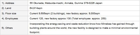 Minebea Co., Ltd. will build a new production facility as part of its strategy to expand operations geared toward the defense and aerospace markets. The new facility with a total floor area of 9,000 ㎡ is to be constructed on the premises of Minebea's Matsuida Plant in Annaka, Gunma Prefecture. Minebea's plans also include closing its Omori Plant in Tokyo due to a lack of sufficient space.