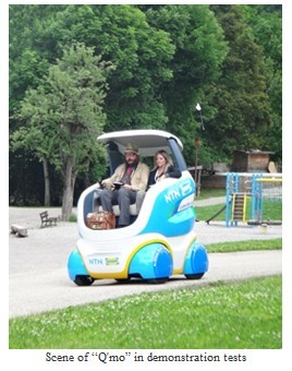 The booth featured dynamic displays of products such as the “One Motor Type Electric Vehicle Drive System*2,” “In-Wheel Motor System for Compact EVs*3” and various sensor technology. The special display area set up in the entrance had on show a “two-seater compact EV” equipped with the In-Wheel Motor System for Compact EVs, and the concept car “Q'mo*4.” Demonstration tests of the “Q'mo” highlighted the potential of cars equipped with the In-Wheel Motor, including “lateral move” and “pivot turn.”