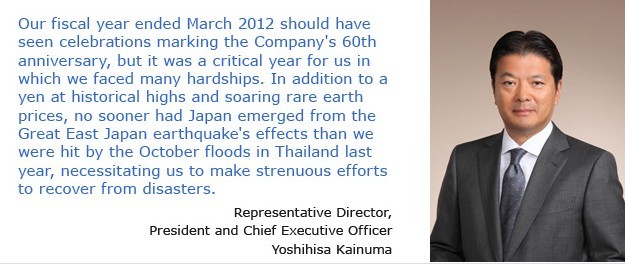 The term ended March 2012 was a year of many negatives, including the earthquake and nuclear power station accident, soaring rare earth prices, record high yen levels and the floods in Thailand. Though the Japanese economy's post-earthquake recovery was rapid, the second half's government debt-driven economic deceleration in Europe impacted the world economy and slowed growth in the U.S. and Asian economies that had theretofore been recovering.