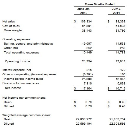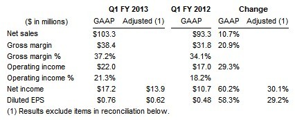 Operating income for the first quarter of fiscal 2013 was $22.0 million, an increase of 29.3% compared to operating income of $17.0 million for the same period last year. As a percentage of net sales, operating income was 21.3% compared to 18.2% for the same period last year.