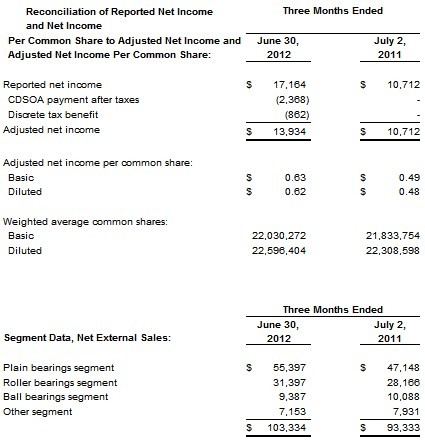 RBC Bearings Incorporated Announces Fiscal 2013 First Quarter Results