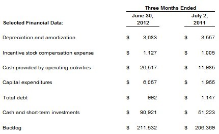 Backlog, as of June 30, 2012, was $211.5 million compared to $206.4 million as of July 2, 2011.