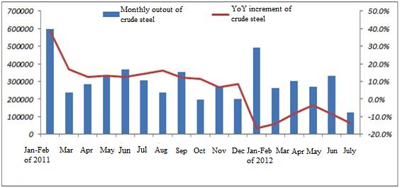 In early August 2012, the day output of crude steel in large and medium-sized enterprises was 1.6205 million tons, 0.82% increased QoQ, and the average day output of crude steel nationwide was estimated to be 1.9699 million tons, 1.05% increased QoQ. This month, some steel mills cut the ex-factory price of steel, wherein, individual producers slashed the prices. However, they made less reduction in the production of bearing steel. Steel mills mainly had the idea to lower the inventory of raw materials, and felt pessimistic about the market outlook.