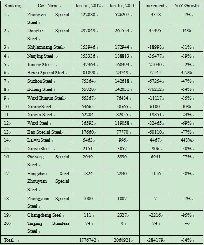 Seen from Table 1 that the top three for bearing steel output from January to July in 2012 are Zhongxin Special Steel (Xinye Steel and Xingcheng Special Steel), Dongbei Speical Steel and Nanjing Steel, and the rankings of other steel mills bore only small change (for Sha Steel, only the yield of Huai Steel counted, and some modifications are made to the statistical method for calculating Baosteel's output).