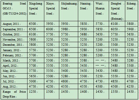 According to the statistics from Mysteeel.com: up to the end of August, 2012, the average price of GCr15 Φ50mm continuous casting non-annealed steel in China was 5,068 yuan/ton; the average price of GCr15 Φ100mm die-casting annealed steel was 7,986 yuan/ton. (some modifications applied to the statistical method)