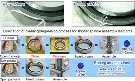 In recent years, as the need for higher energy conservation and a smaller environmental footprint has grown, the need for grease lubrication has increased, since it is less expensive and easier on the environment than that of oil lubrication. However, compared to oil lubrication, grease lubrication is more susceptible to the accumulation of foreign particles and therefore requires highly clean storage. Traditionally, bearings are packed in anti-rust oil to prevent rust during storage and shipping. However, this means that the machine tool makers must wash the bearing and degrease the anti-rust oil prior to applying lubrication grease to the bearing.