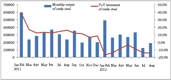 According to the latest data realised by China Iron and Steel Association, the daily crude steel production of large and medium-sized enterprises was 1.5227 million tons in the middle ten days of September 2012, down 2.73% QoQ while the estimated average daily production was 1.8565 million tons, down 2.01% QoQ. At present, steel mills loosened reduction in production, and favorable policies also had stimulation effect on the market. Therefore, the steel mills will gradually give up the idea of production cut, and the market supply and demand pressure is to continue.
