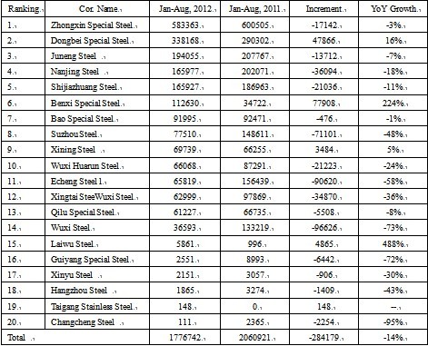 Seen from Table 1 that the top three for bearing steel output from January to August in 2012 are Zhongxin Special Steel (Xinye Steel and Xingcheng Special Steel), Dongbei Speical Steel and Juneng Steel, and the rankings of other steel mills bore only small change (for Sha Steel, only the yield of Huai Steel counted, and some modifications are made to the statistical method for calculating Baosteel's output).