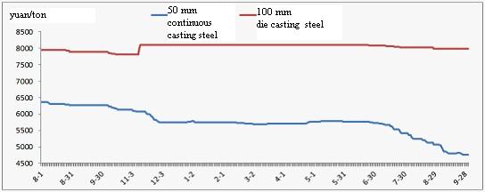 As for Chongqing and Chengdu markets, prices reached their bottom slightly, and the deal was common. Up to the end of September, the average knock-down price of standard GCr15 continuous casting non-annealed steel was from 5050 to 5100 yuan/ton, and the average knock-down price of GCr15 die-casting annealed steel was around 7,400 yuan/ton.