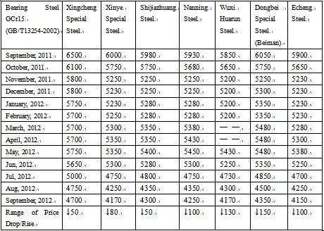 According to the statistics from Mysteeel.com: up to the end of September, 2012, the average price of GCr15 Φ50mm continuous casting non-annealed steel in China was 4,752 yuan/ton; the average price of GCr15 Φ100mm die-casting annealed steel was 7,986 yuan/ton. (some modifications applied to the statistical method)