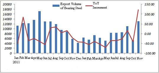 (i) The export volume of bearing steel from January to November in 2012 slightly fell
