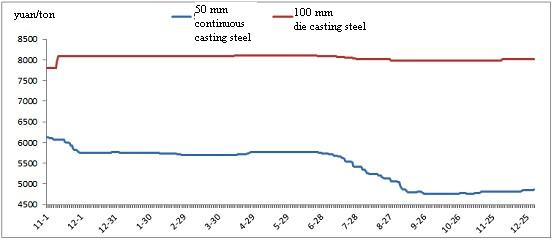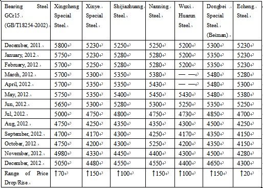 According to the statistics from Mysteeel.com: up to the end of December, 2012, the average price of GCr15Φ50mm continuous casting non-annealed steel in China was 4,861 yuan/ton; the average price of GCr15Φ100mm die-casting annealed steel was 8,011 yuan/ton. (some modifications applied to the statistical method)