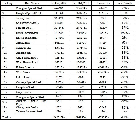Seen from Table 1 that the top three for bearing steel output from January to November in 2012 are Zhongxin Special Steel (Xinye Steel and Xingcheng Special Steel), Dongbei Speical Steel and Juneng Steel, and the rankings of other steel mills bore only small change (for Sha Steel, only the yield of Huai Steel is counted; some modifications are made to the statistical method for calculating Baosteel's output).