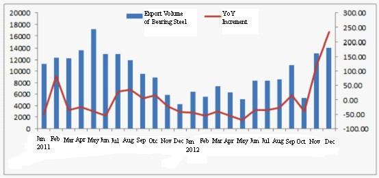 According to the statistical data released by the ten major domestic bearing steel manufacturers, the export volume of bearing steel in December was 14,059 ton, increased by 234.82% year on year. Although the export growth in December obviously increased, the total export volume from January to 2012 was only 99,189 ton, much less compared to 132,913 ton in 2011.