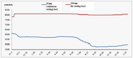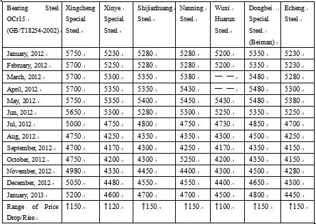According to the statistics from Mysteeel.com: up to the end of January, 2012, the average price of GCr15Φ50mm continuous casting non-annealed steel in China was 4,962 yuan/ton; the average price of GCr15Φ100mm die-casting annealed steel was 8,068 yuan/ton. (some modifications applied to the statistical method)