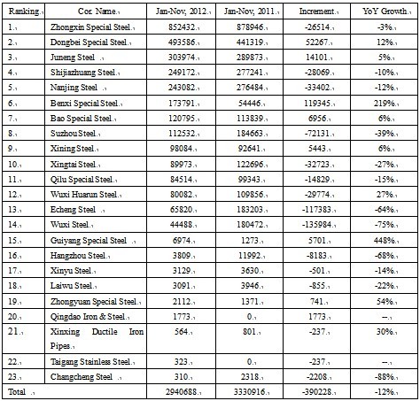 Figure 2: Bearing Steel Export Situation in Major Domestic Special Steel Enterprises from 2011 to 2012