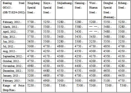 According to the statistics from Mysteeel.com: up to the end of February, 2013, the average price of GCr15Φ50mm continuous casting non-annealed steel in China was 5,087 yuan/ton; the average price of GCr15Φ100mm die-casting annealed steel was 8,068 yuan/ton. (some modifications applied to the statistical method)