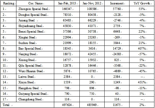 Seen from Table 1 that the top three for bearing steel output from January to February in 2013 are Zhongxin Special Steel (Xinye Steel and Xingcheng Special Steel), Dongbei Speical Steel and Juneng Steel, and some steel mills have not arranged production yet (for Sha Steel, only the yield of Huai Steel is counted; some modifications are made to the statistical method for calculating Baosteel's output).