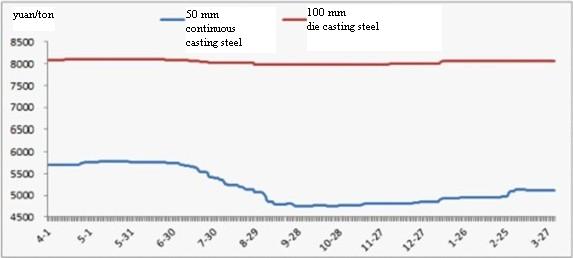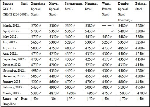 According to the statistics from Mysteeel.com: up to the end of March, 2013, the average price of GCr15Φ50mm continuous casting non-annealed steel in China was 5,115 yuan/ton; the average price of GCr15Φ100mm die-casting annealed steel was 8,068 yuan/ton. (some modifications applied to the statistical method)