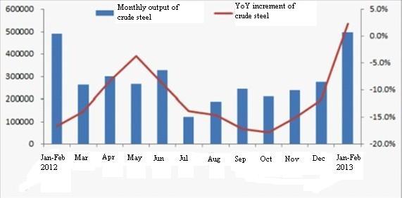 Domestic auto production and sales was respectively 331.17 and 3.3891 million units in January-February, with an increase of 14.1% and 14.7%; appliances retail sales increased by 16.7% 7.5 percentage points up compared with December 2012; machinery/excavator sales was 11328 units, down 47% YoY.