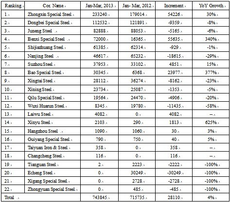 Seen from Table 1 that the top three for bearing steel output from January to March in 2013 are still Zhongxin Special Steel (Xinye Steel and Xingcheng Special Steel), Dongbei Speical Steel and Juneng Steel, and some steel mills have just put into operation in March or only on the way (for Sha Steel, only the yield of Huai Steel is counted; some modifications are made to the statistical method for calculating Baosteel's output).