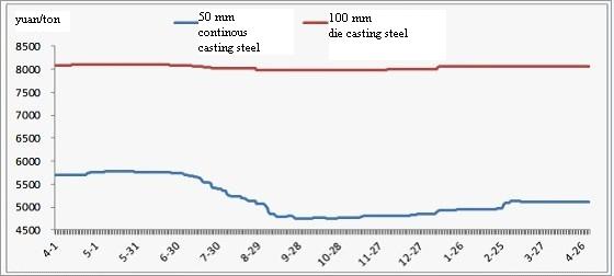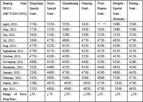 According to the statistics from Mysteeel.com: up to the end of April, 2013, the average price of GCr15Φ50mm continuous casting non-annealed steel in China was 5,107 yuan/ton; the average price of GCr15Φ100mm die-casting annealed steel was 8,068 yuan/ton. (some modifications applied to the statistical method)