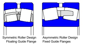 There are generally two basic designs for spherical roller bearings. A symmetric roller design, that uses a floating center guide flange that allows longer rollers to be used, which directly increases the radial load capacity of the bearing. The asymmetric roller design has fixed guide flanges on the inner ring. This design allows for greater thrust capacity and provides a more true rolling motion and is used almost exclusively on larger bearings.