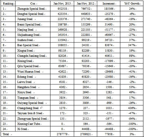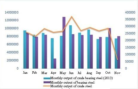 Seen from Table 1 that the top three for bearing steel output from January to November in 2013 are still Zhongxin Special Steel (Xinye Steel and Xingcheng Special Steel), Dongbei Speical Steel and Juneng Steel. (for Sha Steel, only the yield of Huai Steel is counted; some modifications are made to the statistical method for calculating Baosteel's output). Among these 25 companies, the crude bearing steel ouput of 10 companies increased while 14 fell.