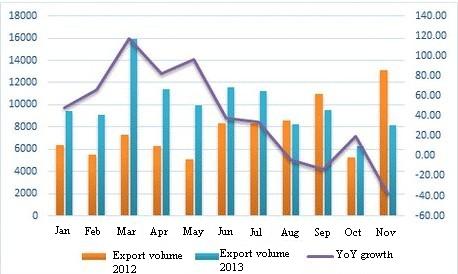 (i) The export volume of bearing steel from January to November in 2013 slightly fell