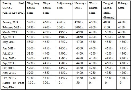 Table 2: Summary of Sales Price of Major Bearing Steel Manufacturers in East China (standard continuous casting non-annealed steel bar) Unit: yuan