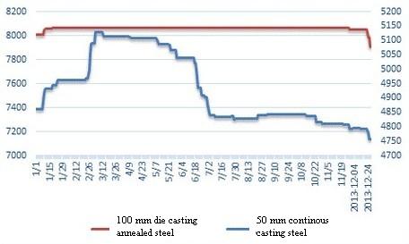 According to the statistics from Mysteeel.com: up to the end of December, the average price of GCr15Φ50mm continuous casting non-annealed steel in China was 4,755 yuan/ton; the average price of GCr15Φ100mm die-casting annealed steel was 7,911 yuan/ton. (some modifications applied to the statistical method)
