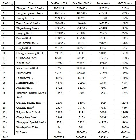 Seen from Table 1 that the top three for bearing steel output from January to December in 2013 are still Zhongxin Special Steel (Xinye Steel and Xingcheng Special Steel), Dongbei Speical Steel and Juneng Steel. (for Sha Steel, only the yield of Huai Steel is counted; some modifications are made to the statistical method for calculating Baosteel's output). Among these 25 companies, the crude bearing steel ouput of 12 companies rose while 13 fell.