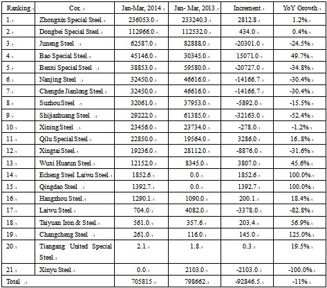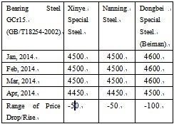 Seen from Table 1 that the top three for bearing steel output from January to March in 2014 are Zhongxin Special Steel (Xinye Steel and Xingcheng Special Steel), Dongbei Speical Steel and Juneng Steel. (for Sha Steel, only the yield of Huai Steel is counted; some modifications are made to the statistical method for calculating Baosteel's output). Among these 21 companies, the crude bearing steel ouput of 11 companies rose while 10 fell.