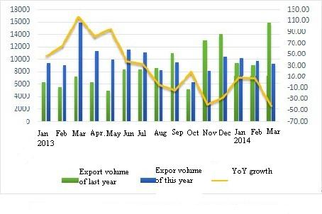 According to the statistical data released by the ten major domestic bearing steel manufacturers, the bearing steel export volume was 9,281 tons in March, 2014, down 41.78% YoY; the cumulative export volume in the same period was 29,278 tons, decreased by 5,191 tons YoY.
