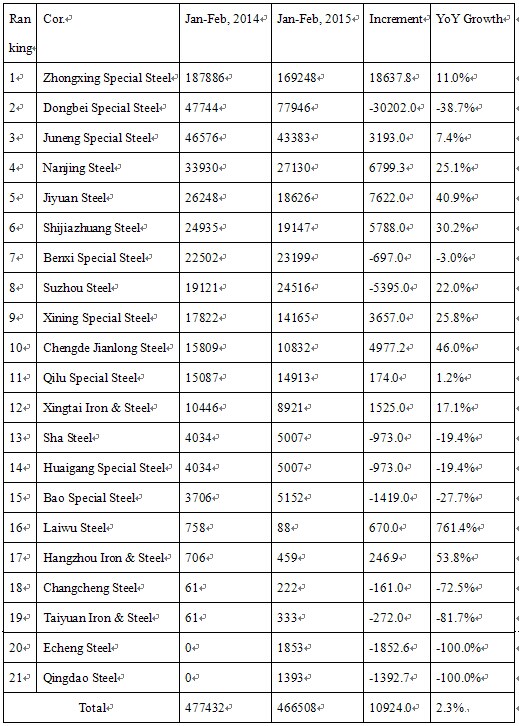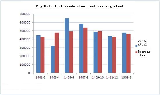 Seen from Table 1 that the top three for bearing steel output from January to March in 2014 are Zhongxin Special Steel (Xinye Steel and Xingcheng Special Steel), Dongbei Speical Steel and Juneng Steel. (for Sha Steel, only the yield of Huai Steel is counted). Among these 21 companies, the crude bearing steel ouput of 11 companies rose while 10 fell.