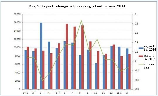 Domestic bearing steel export was 8471 tons in February, decreased by 13.3% YoY, increased by 5.8% MoM. Total export in January-February was 16,477 tons, representing a reduction of 23.52% over the same period last year.
